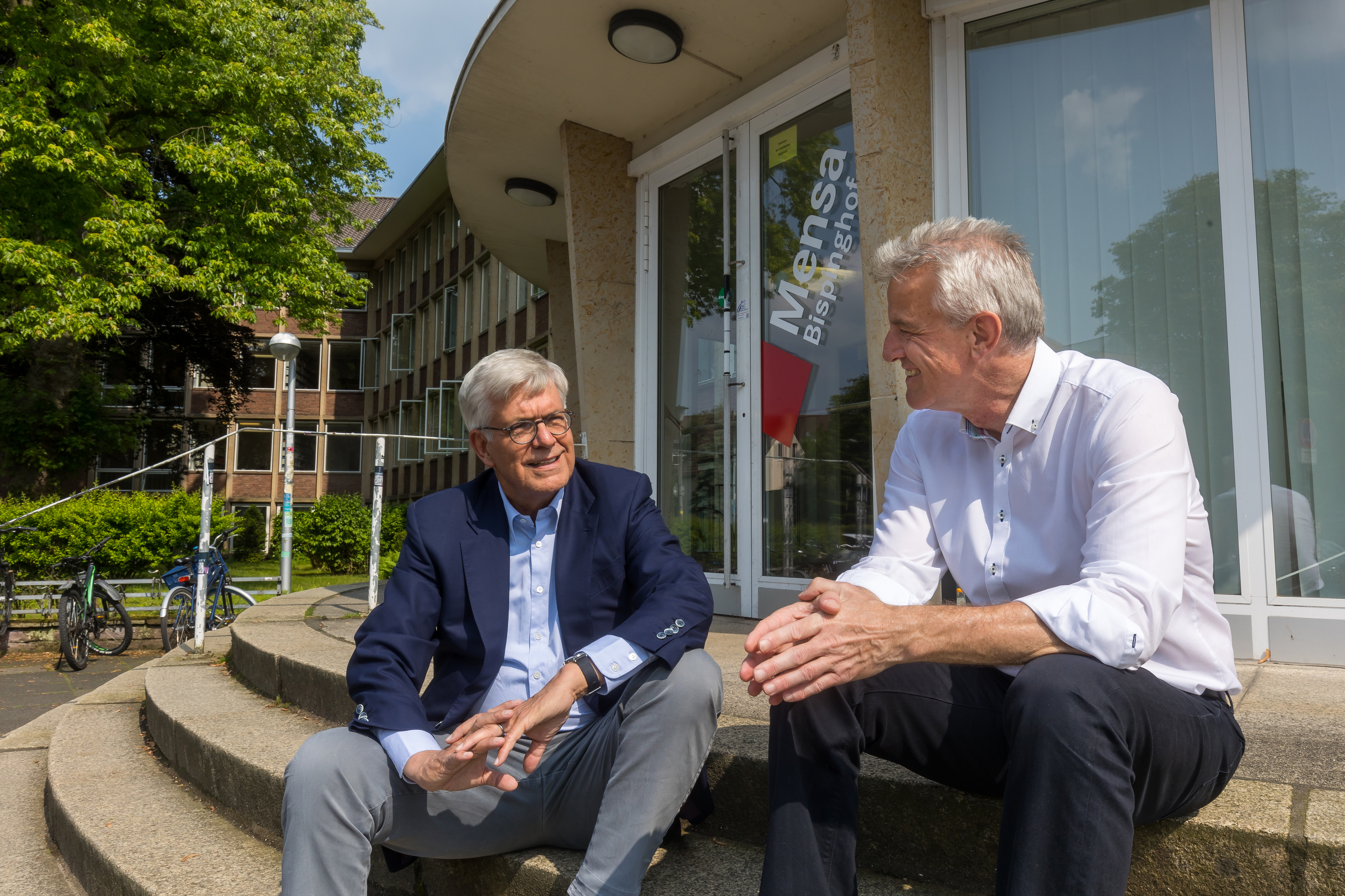 Der gebürtige Osnabrücker wohnt seit vielen Jahren in Mainz, und das ausgesprochen gerne. Aber beim Spaziergang durch die münstersche Innen- und Altstadt weist Thomas Bellut gleich mehrfach darauf hin, dass Münster „dank des perfekten Wiederaufbaus nach dem Zweiten Weltkrieg noch eine Spur schöner und attraktiver“ als die rheinland-pfälzische Landeshauptstadt sei. „Der Domplatz, der Prinzipalmarkt, die Bögen – einfach klasse.“ Nicht zuletzt deswegen habe er sich auch zu seinen Studienzeiten sehr wohl in Münster gefühlt, als er anfangs in einer Kellerwohnung in der Nähe der Wolbecker Straße und später in der Siverdesstraße gewohnt habe, als er täglich mit dem Rad zur Universität gefahren sei und seine Zeit im Ruderclub am Kanal genossen habe. Als wir die Promenade passieren, erinnert er sich an seine Touren über die münstersche „Fahrrad-Autobahn“. „Einer der schönsten Radwege, die ich kenne“, betont er.