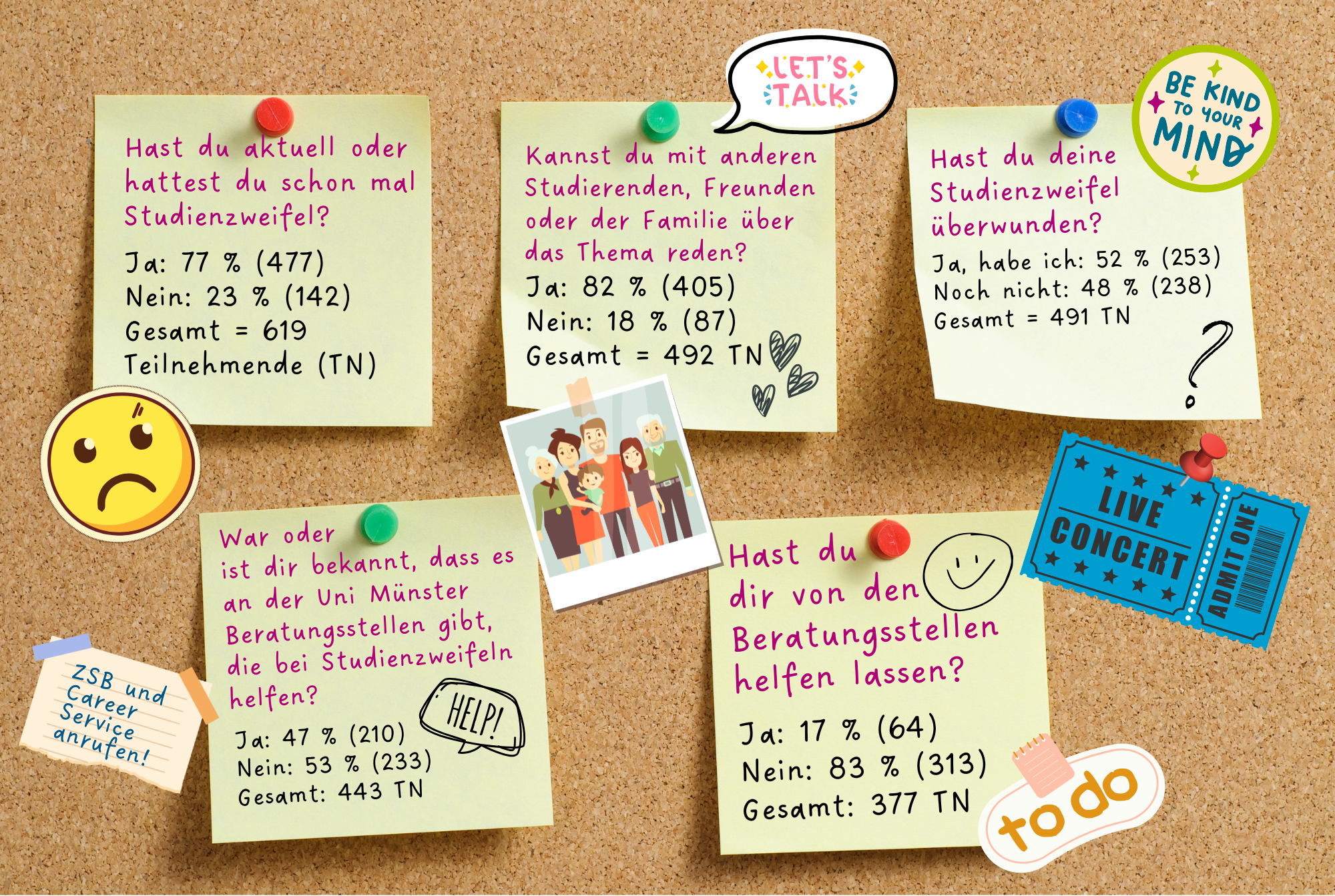 Die Grafik zeigt eine Pinnwand. An dieser sind verschiedene Zettel geheftet, die die Fragen und Ergebnisse einer Instagramumfrage zum Thema Studienzweifel enthalten.<address>© Grafik: Uni MS - Alice Büsch</address>