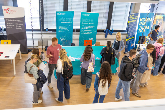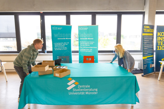 Um 8.27 Uhr treffen die ersten Teilnehmenden am Stand der Universität Münster ein. „Drei Minuten zu früh“, sagt Andre Beck mit einem Augenzwinkern und fragt sogleich: „Wie kann ich euch weiterhelfen?“ Kurz danach strömen Dutzende weitere Schülerinnen und Schüler in das Gebäude und erkunden das vielfältige Messeangebot. Auch der Stand der ZSB ist nach kurzer Zeit gut besucht. Hannah Wantia und Andre Beck lassen sich vom Getümmel nicht aus der Ruhe bringen. Geduldig beantworten sie die vielen Fragen. Eine Interessierte möchte wissen, was der Unterschied zwischen Ein- und Zwei-Fach-Bachelor ist, eine weitere Schülerin interessiert sich für Sportpsychologie, ein Schüler möchte Medizin studieren, hat aber Sorge, dass sein Abiturschnitt nicht ausreicht. Andre Beck erklärt die Grundlagen des Bewerbungsverfahrens, das bundesweit von anderen Studiengängen abweicht und daher häufig Fragen aufwerfe. Dann verweist er auf die Möglichkeit, mit einem „Freiwilligen Sozialen Jahr“ eine Chance auf zusätzliche Bewerbungspunkte zu bekommen und den Test für medizinische Studiengänge (TMS), der den Notenschnitt aufwerten kann. Zudem bietet er an, einen Termin bei der ZSB zu vereinbaren, um die Fragen und Anforderungen in Ruhe zu besprechen. „Einige Anliegen sind für eine Kurzberatung auf einer Messe zu umfangreich“, erklärt der Studienberater. „Daher regen wir häufig an, Termine bei uns zu vereinbaren.“ Der Schüler bedankt sich und geht einen Stand weiter. Für den Berater bleibt Zeit für einen Schluck Wasser, die nächste Schülerin steht schon bereit.