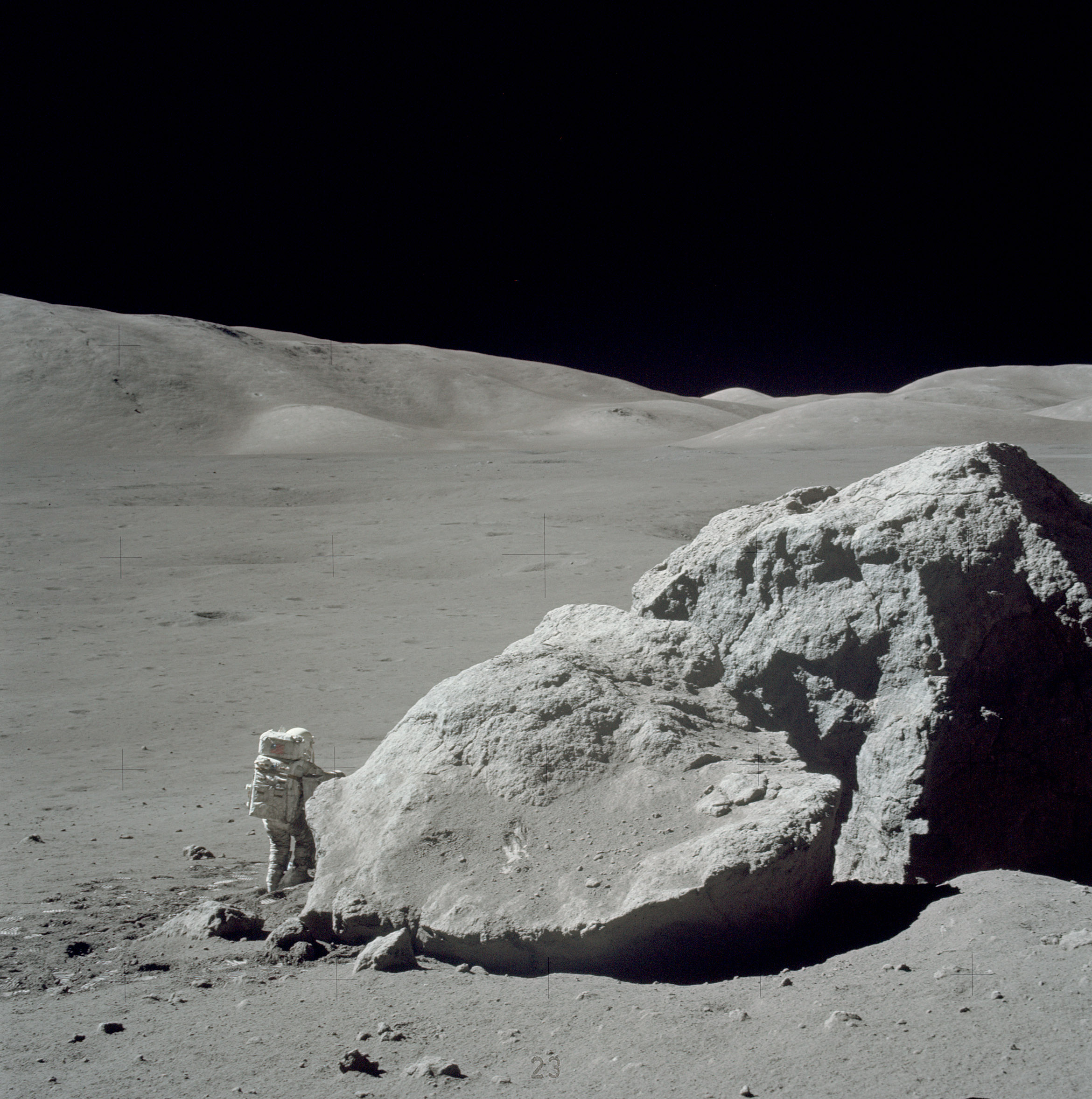 Vor 53 Jahren betrat mit Apollo 17 zuletzt ein Mensch den Mond – hier steht Astronaut und Geologe Harrison H. Schmitt am 13. Dezember 1972 neben einem großen gespaltenen Felsen. Forschern der Universität Münster ist es nun gelungen, mithilfe von Satellitenbildern und KI rund 94 Millionen Felsblöcke auf der Mondoberfläche zu kartieren.<address>© NASA - Eugene A. Cernan</address>