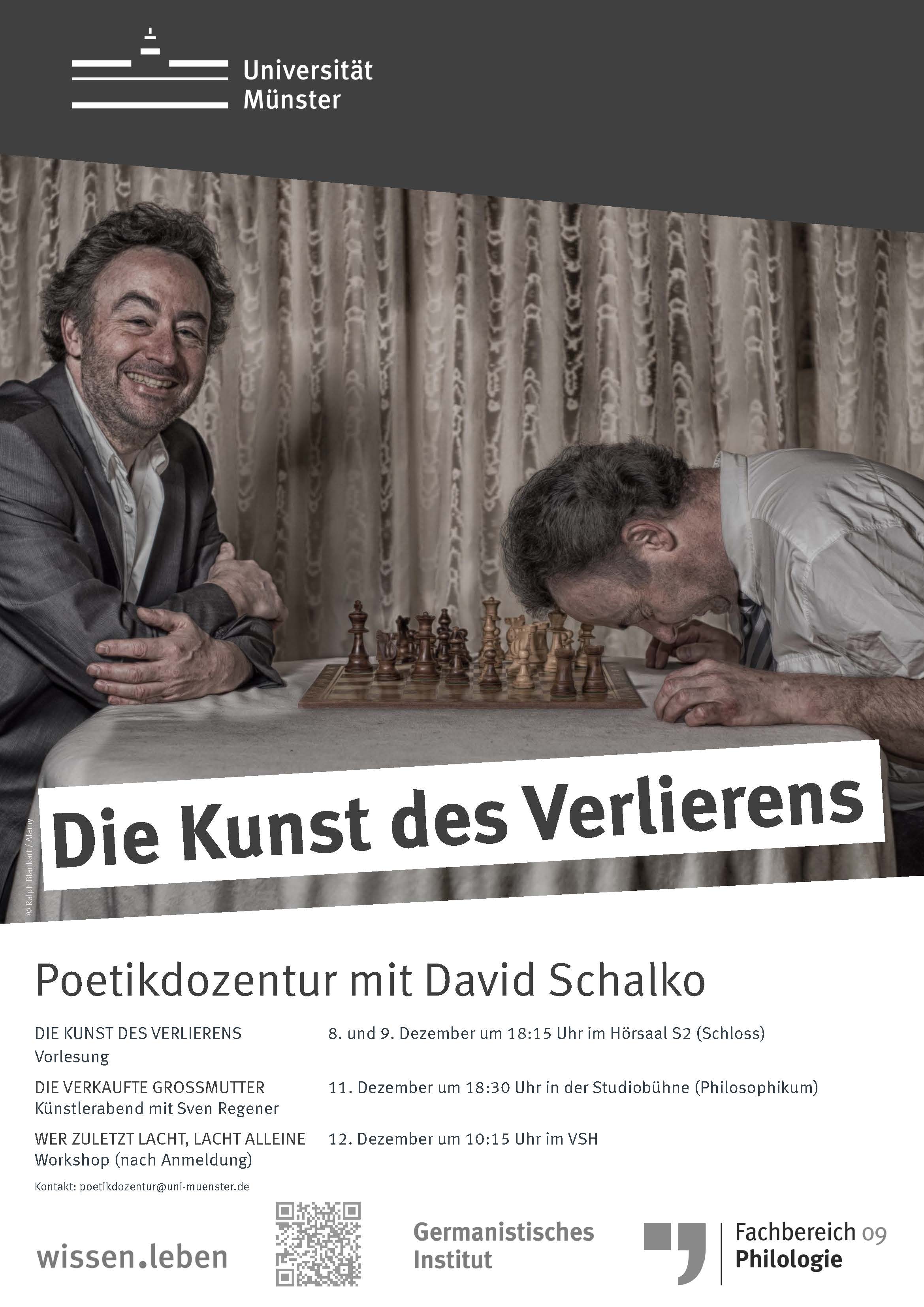 Der österreichische Autor, Regisseur und Produzent David Schalko übernimmt die sechste Poetikdozentur am Germanistischen Institut der Universität Münster. Eine Reihe von Veranstaltungen mit ihm richtet sich an Studierende, Angehörige der Universität sowie die interessierte Öffentlichkeit. David Schalko stellt seine Dozentur unter das Thema „Die Kunst des Verlierens“. Vom 8. bis 12. Dezember finden mehrere Veranstaltungen statt: zwei öffentliche Vorlesungen (8. und 9. Dezember), ein Künstlerabend mit dem Musiker und Romancier Sven Regener (11. Dezember) sowie ein Workshop für Studierende (12. Dezember). Der Eintritt ist zu allen Veranstaltungen frei.