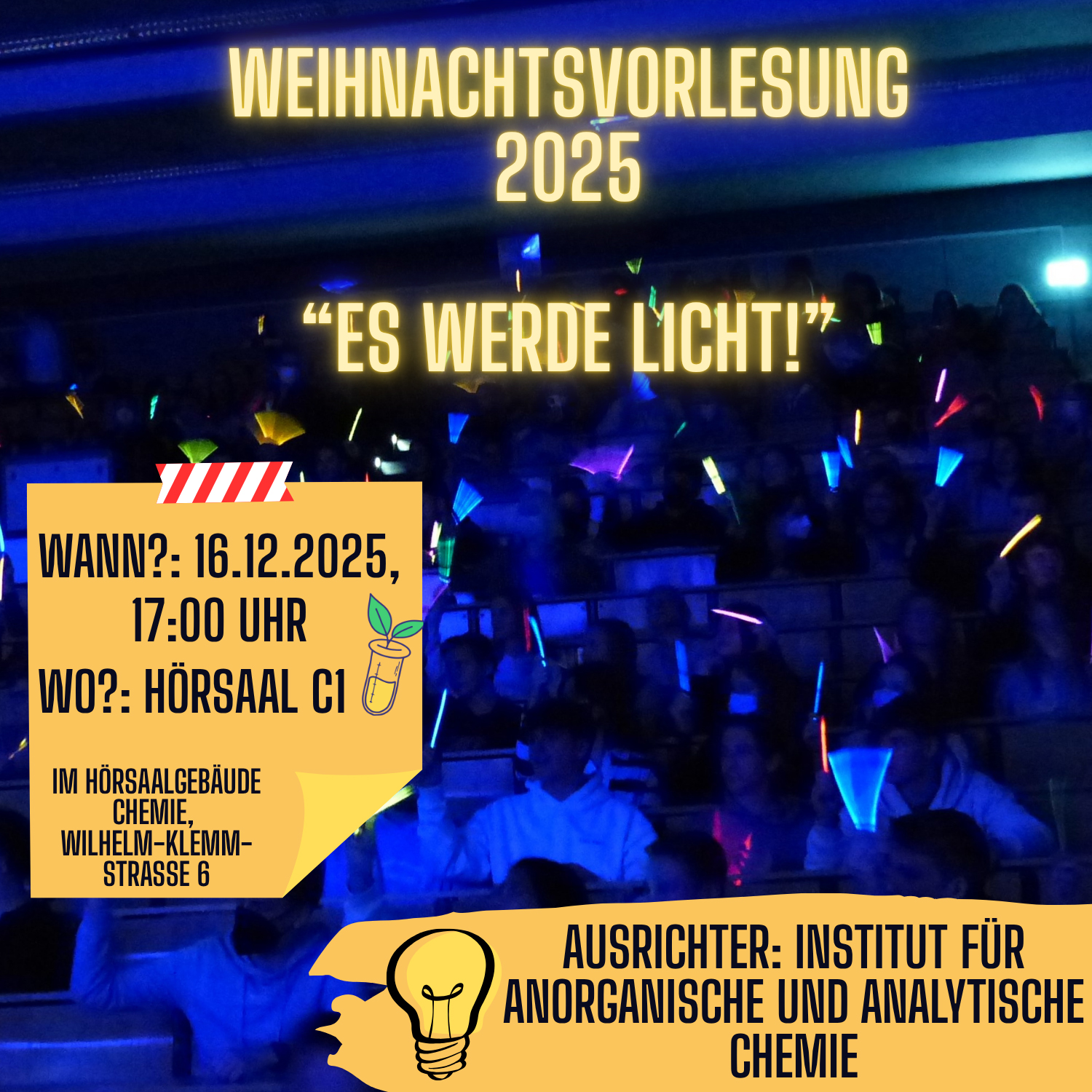 Der Fachbereich Chemie und Pharmazie lädt am 16. Dezember zur traditionellen Weihnachtsvorlesung ein. Die Veranstaltung ist öffentlich, alle Interessierten sind willkommen. Prof. Dr. Uwe Karst und Chemielaborant Michael Holtkamp vom Institut für Anorganische und Analytische Chemie gehen der Faszination des Lichts in all seinen Facetten nach: Wie nehmen wir es wahr? Wie lässt sich (farbiges) Licht erzeugen? Und was hat das mit Chemie zu tun? Die Vorlesung mit dem Titel „Es werde Licht!“ beginnt um 17 Uhr im Hörsaal C1 (Hörsaalgebäude Chemie, Wilhelm-Klemm-Straße 6). Einlass in den Hörsaal ist ab 16.45 Uhr. Es sind keine Vorkenntnisse nötig.