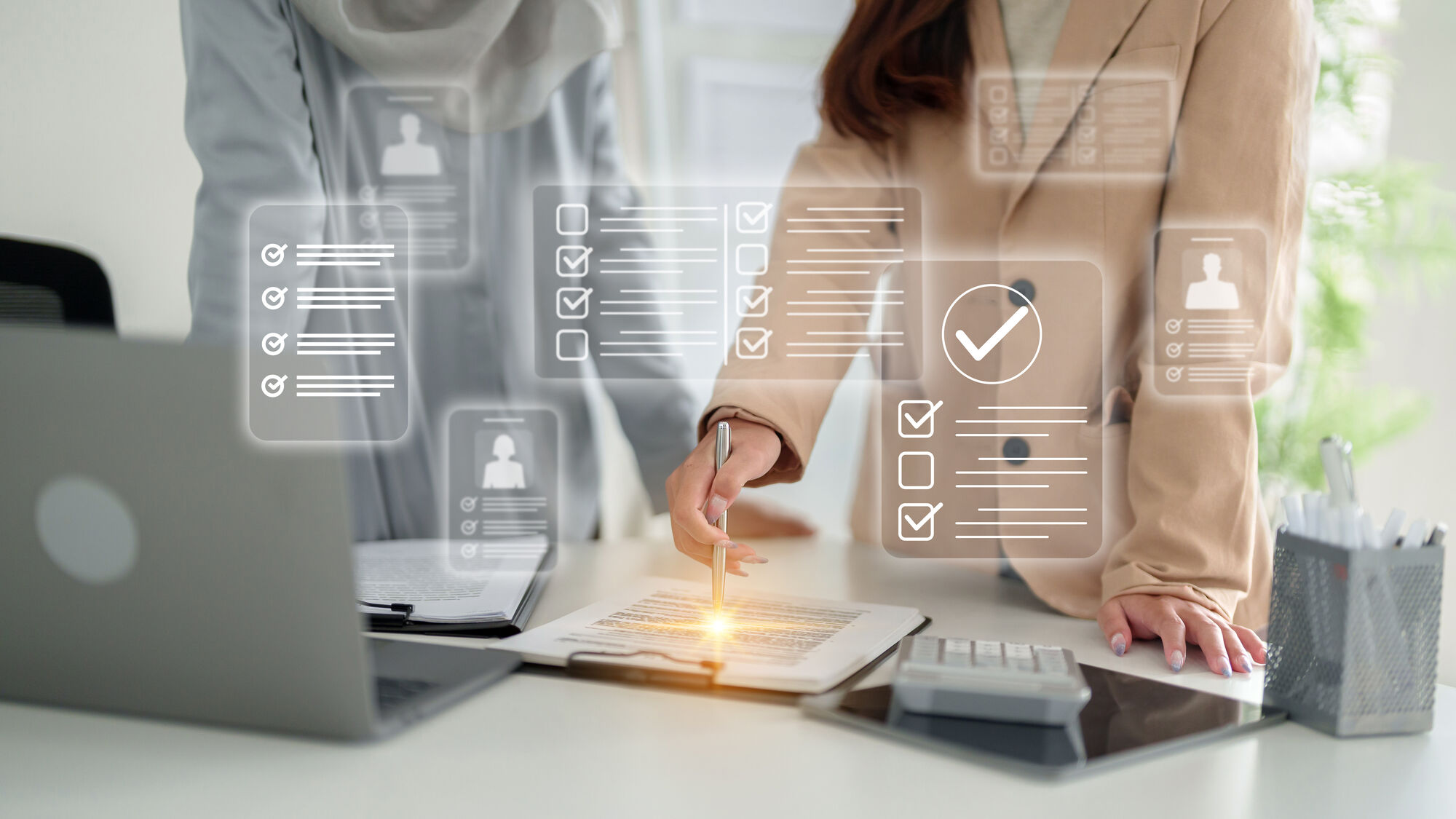 Zwei Personen stehen an einem Schreibtisch in einem Büro. Eine Person markiert mit einem Stift ein Dokument auf einem Klemmbrett. Auf dem Tisch liegen ein Laptop, ein Tablet und ein Taschenrechner. Über dem Bild sind symbolisch digitale Checklisten und Häkchen eingeblendet, die für Prüfung, Auswahl oder Bewertung stehen.<address>© stock.adobe.com - STBSTD</address>