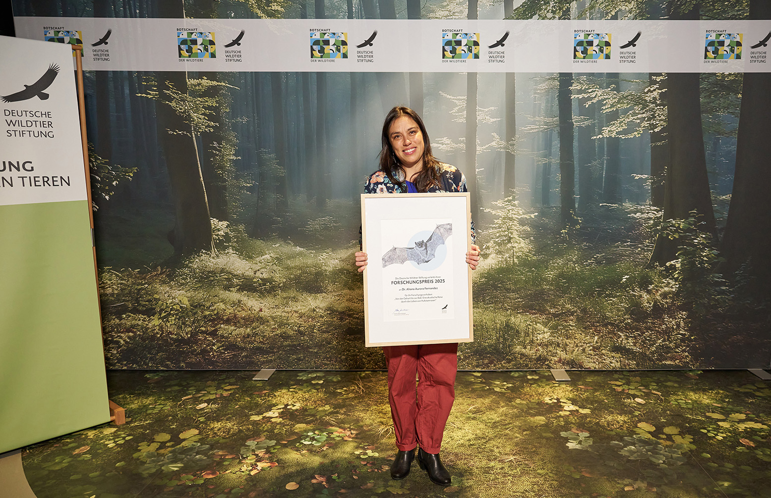 Dr. Ahana Fernandez im Ganzkörperporträt bei der „Deutschen Wildtier Stiftung“ in Berlin. Sie steht vor einer Waldfotowand und hält einen großen Bilderrahmen mit der Urkunde zum Forschungspreis vor den Körper (auf der Urkunde ist eine Fledermaus zu erkennen). Auf einem Banner oben und einem Aufsteller links ist mehrfach das Logo der Stiftung und der „Botschaft der Wildtiere“ zu erkennen (Silhouette eines Greifvogels und bunte, abstrahierte Vögel).<address>© Deutsche Wildtier Stiftung / Brandes</address>