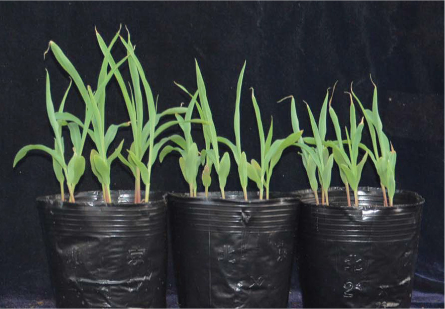 Comparison of maize seedling growth in saline soil: on the left, the wild type; on the right, two pots with plants in which the newly discovered signaling pathway does not function.