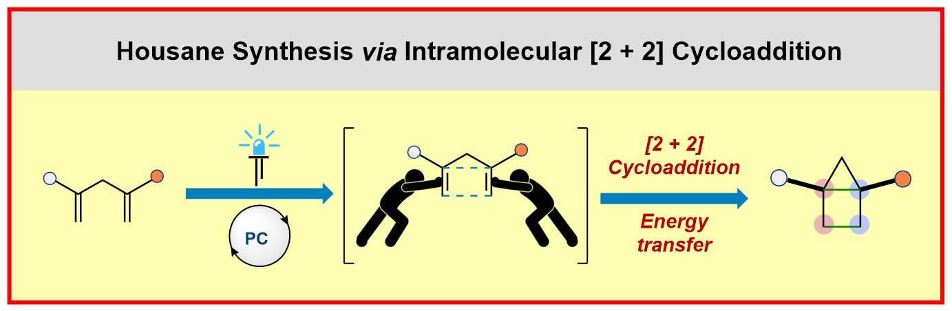 Small ring molecules are under strong tension similar to a bent branch. The release of tension can drive downstream reactions, thereby enabling efficient access to valuable products. However, high-tensile molecules are difficult to produce. Previous methods for producing housane often require “harsh” conditions, such as high temperatures, and they do not work with many additional atoms or atom groups, known as functional groups, on the starting molecules. However, it is precisely these functional groups that are crucial for the properties of a molecule.