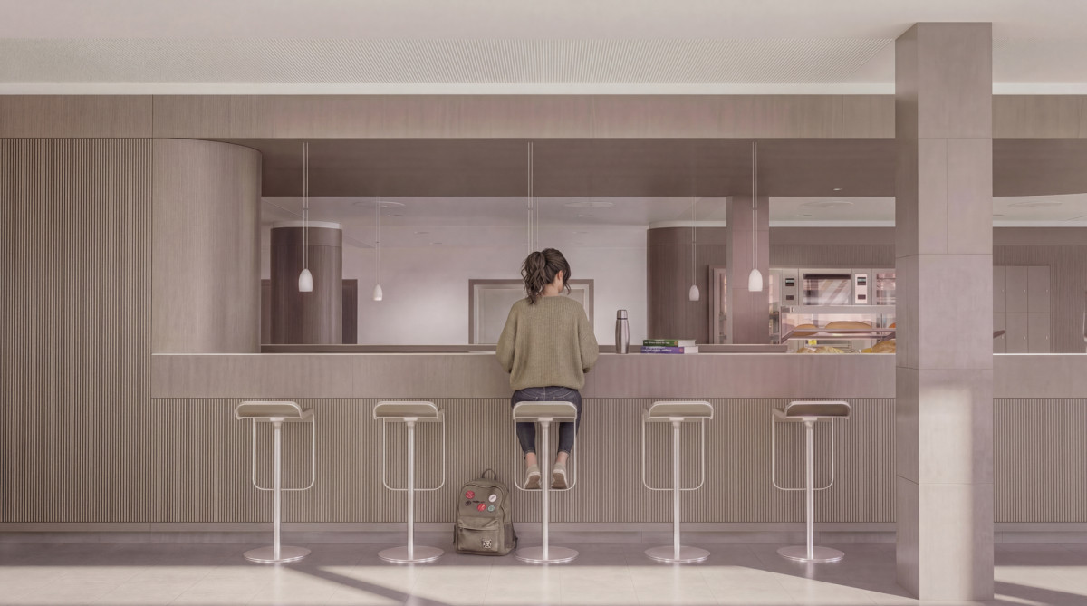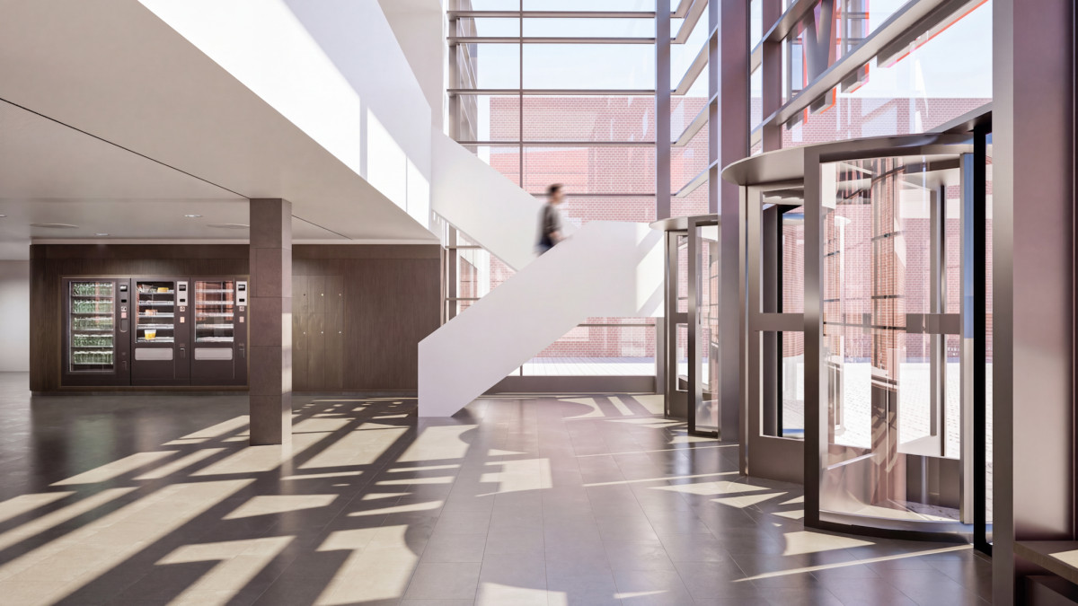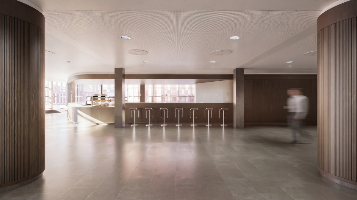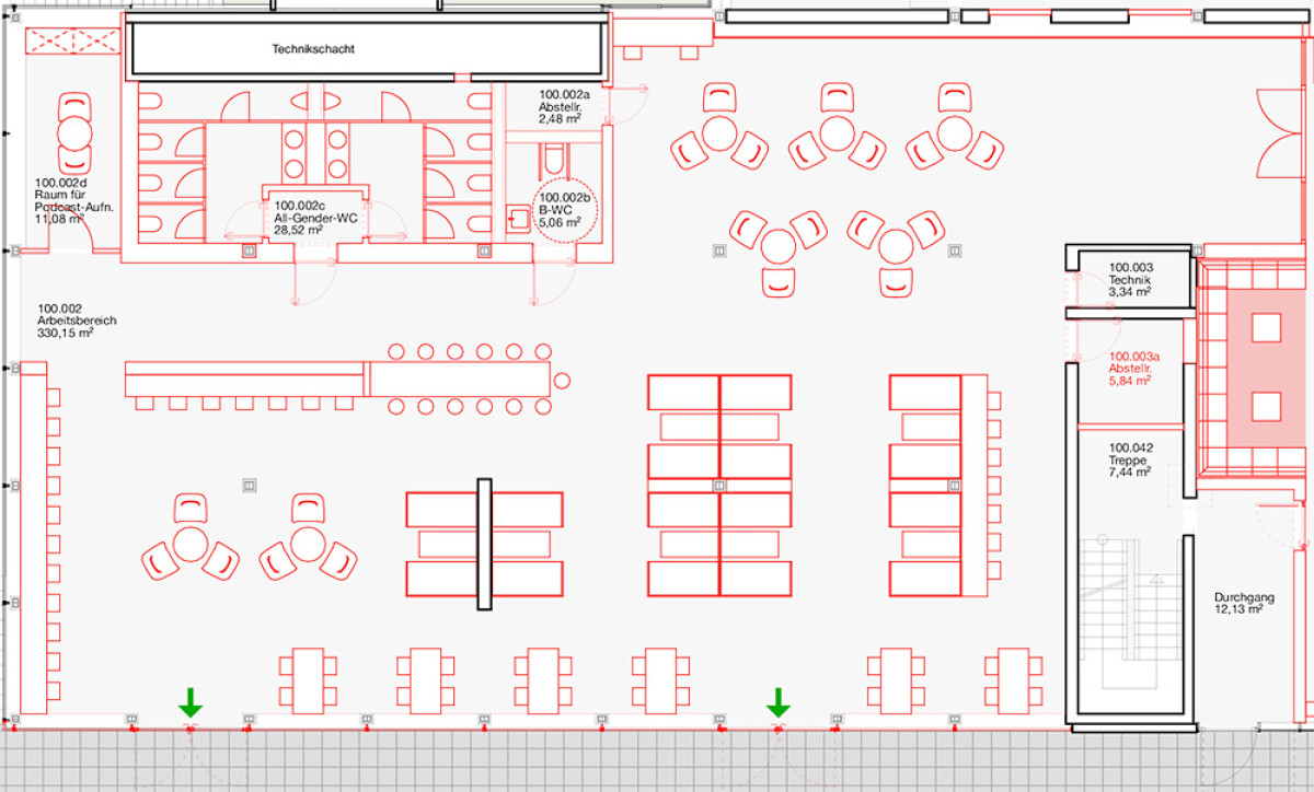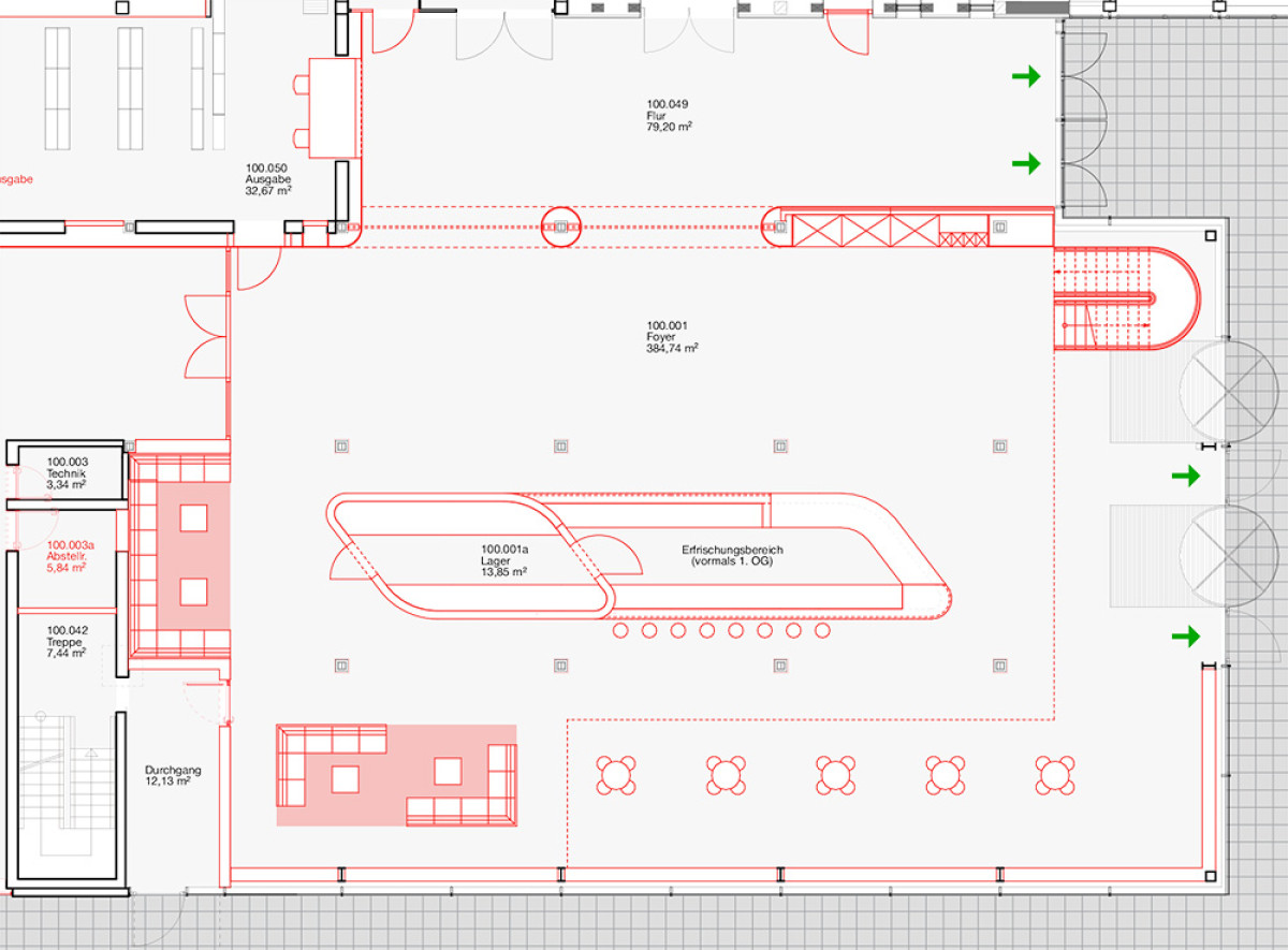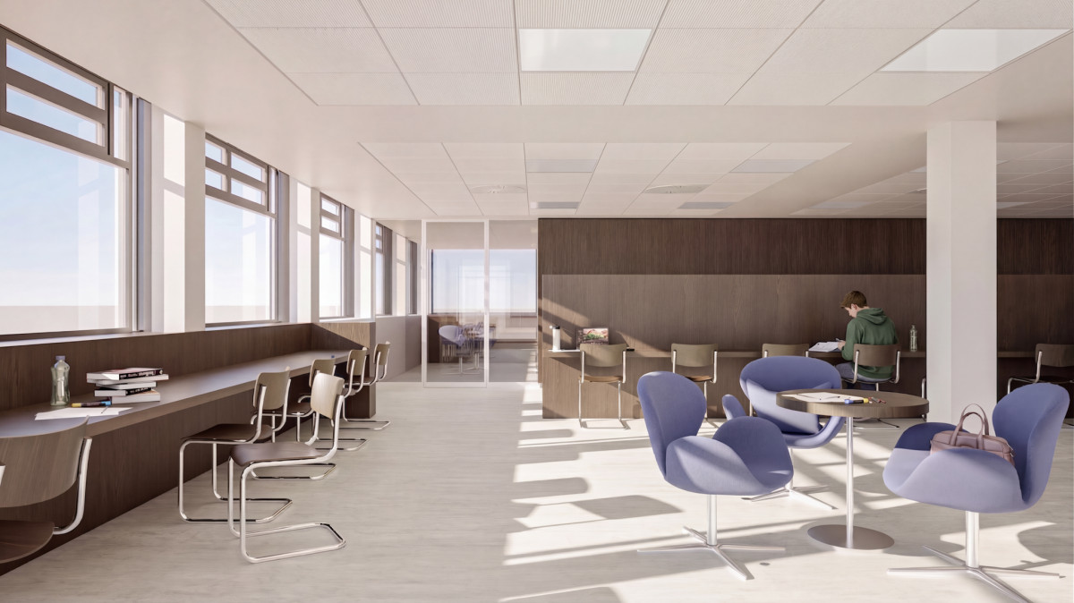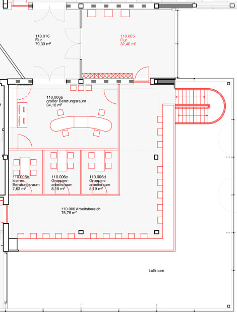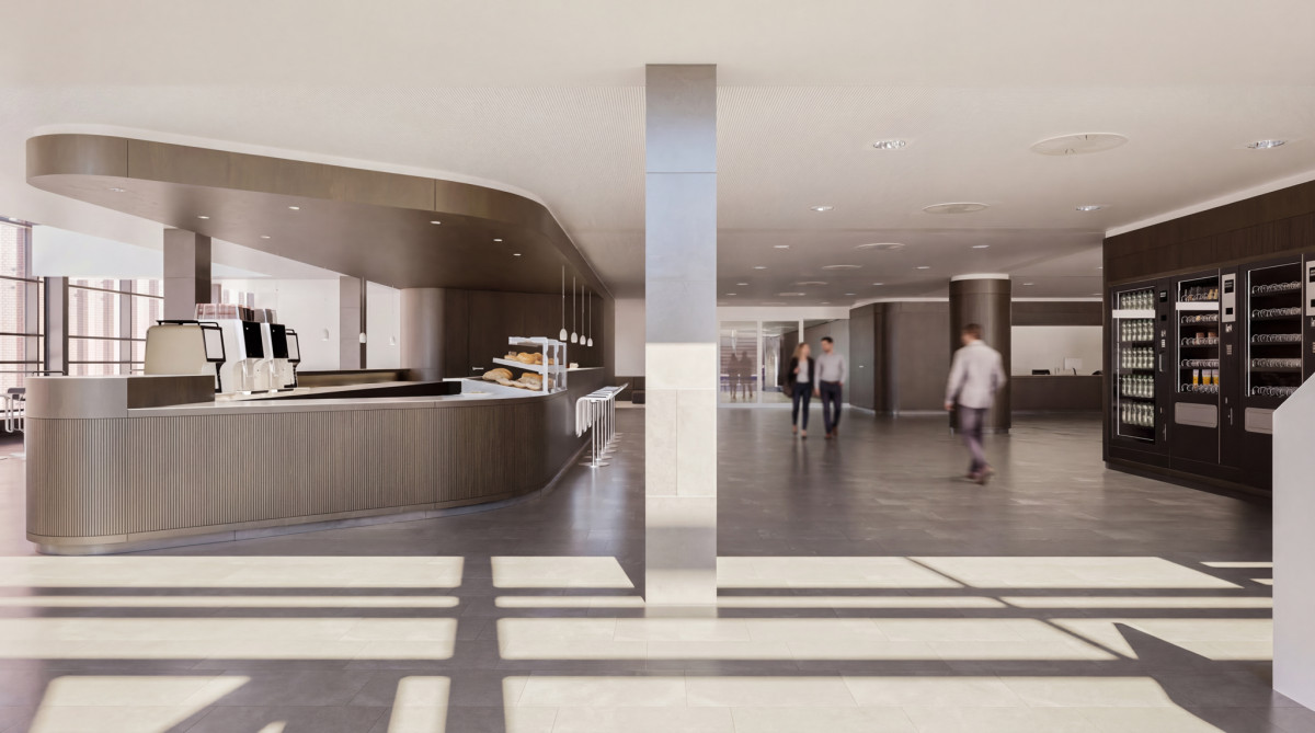 Im ersten Obergeschoss entsteht eine Empore mit 25 Arbeitsplätzen, die über eine neue Treppe im Foyer erreichbar sein wird. Zudem ziehen die Information und Beratung in den ersten Stock. Die ehemalige Cafeteria wird umgestaltet und flexible Arbeitsflächen aufweisen. Zwei buchbare Gruppenarbeitsräume, ein Schulungsraum, der auch als Arbeitsraum nutzbar sein wird, und genderneutrale sowie barrierefreie WC-Anlagen komplettieren den Umbau.