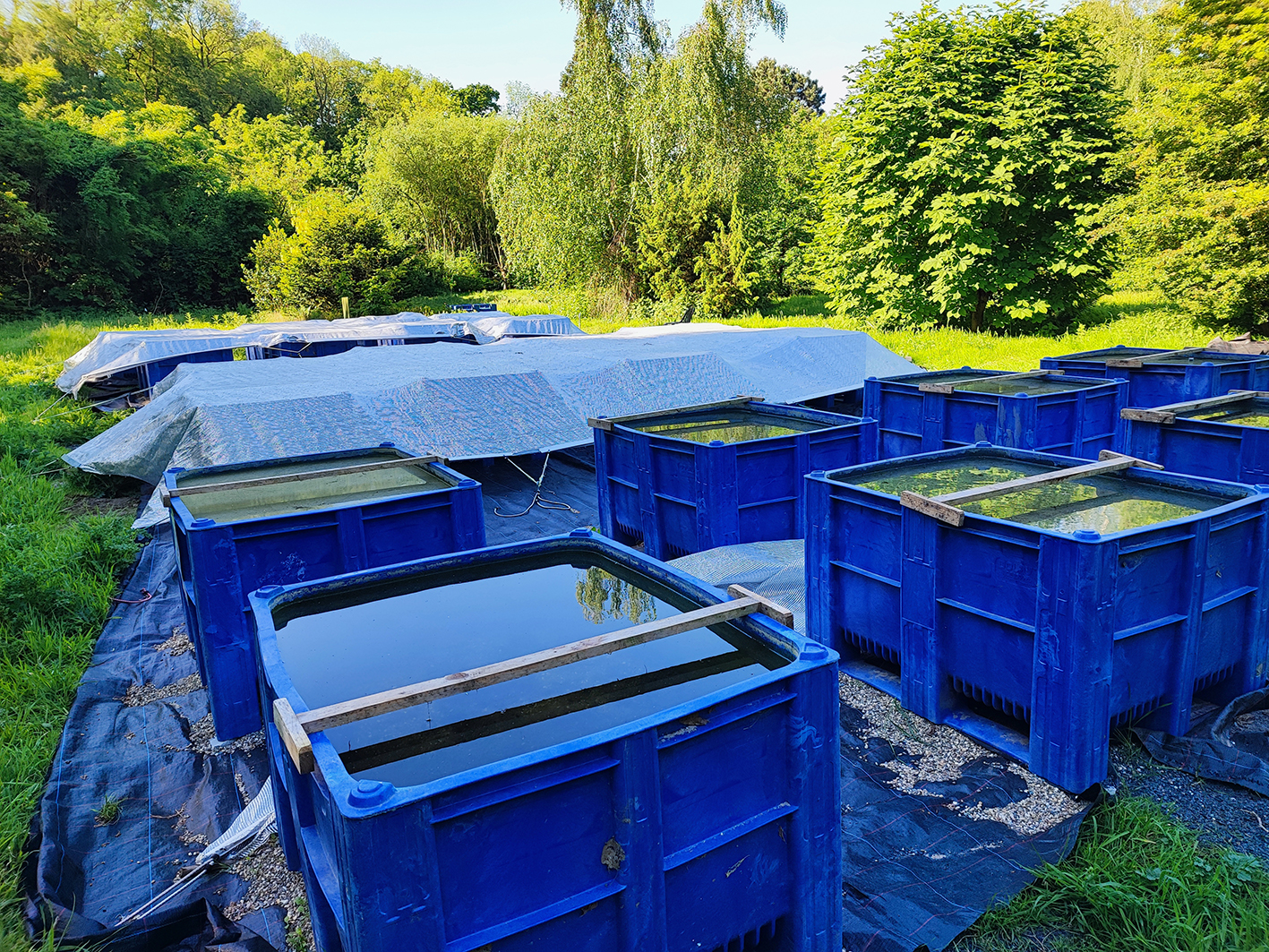 Artificial open-air ponds: Four rows of blue plastic water basins stand in a meadow, with trees and shrubs in the background. The basins in the two rear rows are covered with sheets, whilst the surface of the water is visible in the front rows. A total of 15 basins are visible.<address>© Jaime M. Anaya-Rojas</address>