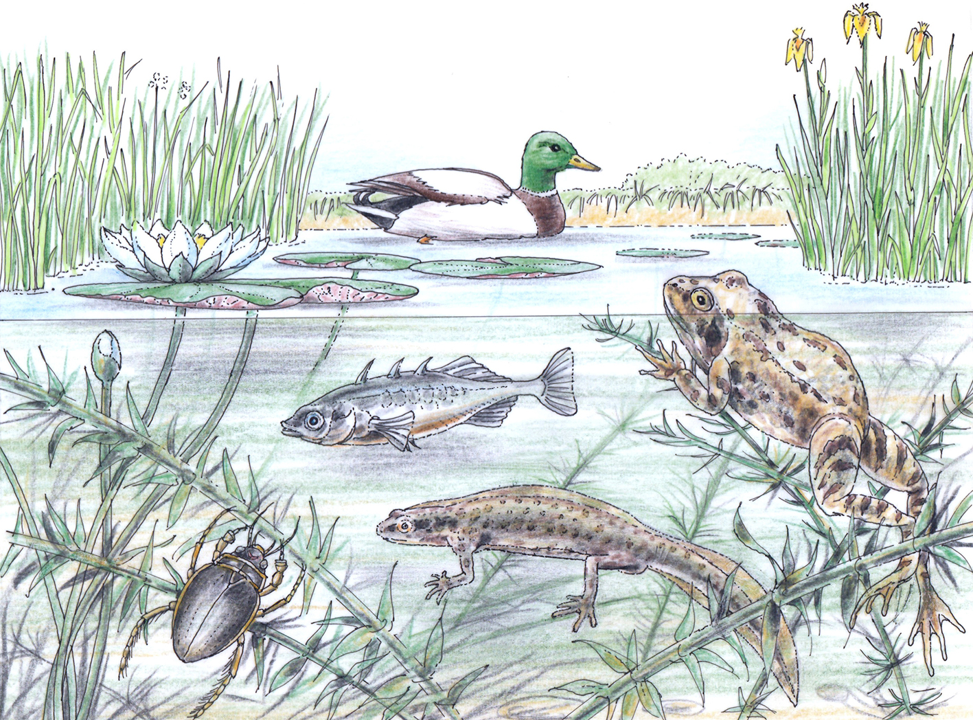 Illustration of various animals in a pond (mallard, common frog, great diving beetle, white water-lily, three-spined stickleback)<address>© Illustration: Lewisroland - stock.adobe.com</address>
