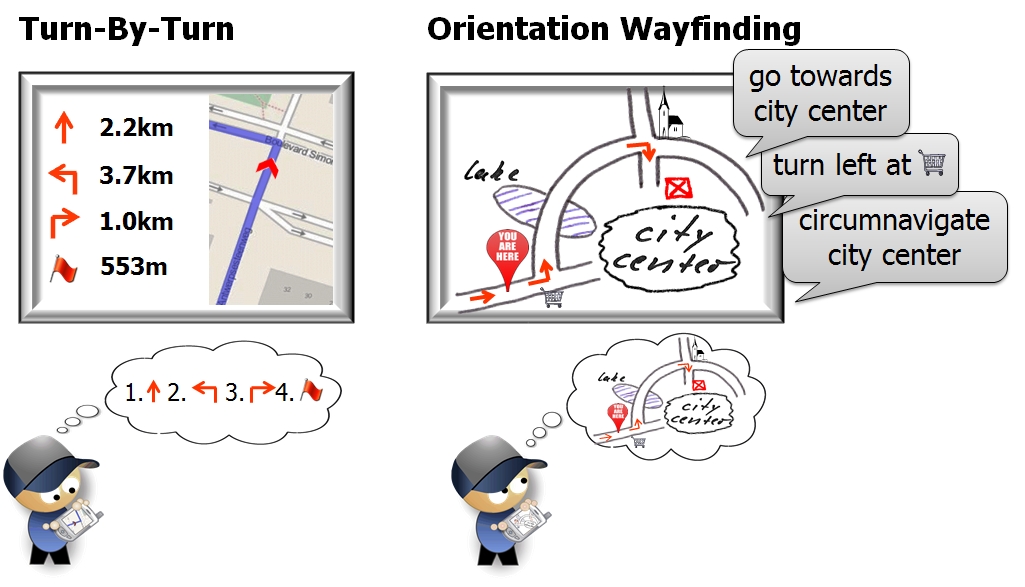 Although navigation systems have gone through tremendous development, they suffer from fundamental shortcomings: State-of-the art navigation systems still adhere to the principles of turn-by-turn navigation. At each decision point, users receive the next turn instruction guiding them towards the destination. The user has no orientation and no overview of the surrounding environment. Schwering argues that turn-by-turn navigation is cognitively inadequate: When humans perform wayfinding, they do not execute instructions sequentially one after another, but they learn the spatial configuration during wayfinding and build up cognitive maps to orient themselves.