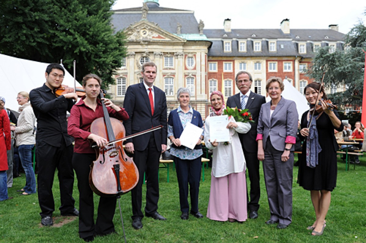 Am Anfang standen allerdings zwei zu ehrende Gäste im Mittelpunkt des Empfangs. Rektorin Prof. Dr. Ursula Nelles zeichnete die Medizinstudentin Abeer Al-Athwari für ihre Studienleistungen und ihr soziales Engagement als beste ausländische Studierende aus. Die 29-jährige Doktorandin habe „nicht nur ihr Studium mit einem sehr guten Abschluss beendet“, lobte die Rektorin, „sondern sie hat sich auch sehr für ihre ausländischen Kommilitonen eingesetzt und sich im Rahmen der studentischen Selbstverwaltung engagiert“. Zur Ehre kommen 1000 Euro hinzu – gestiftet vom Deutschen Akademischen Austauschdienst (DAAD).