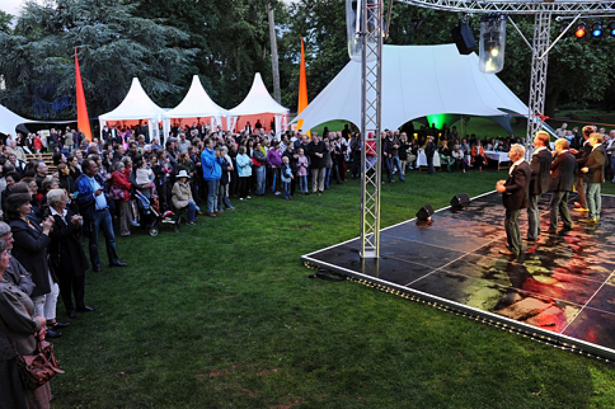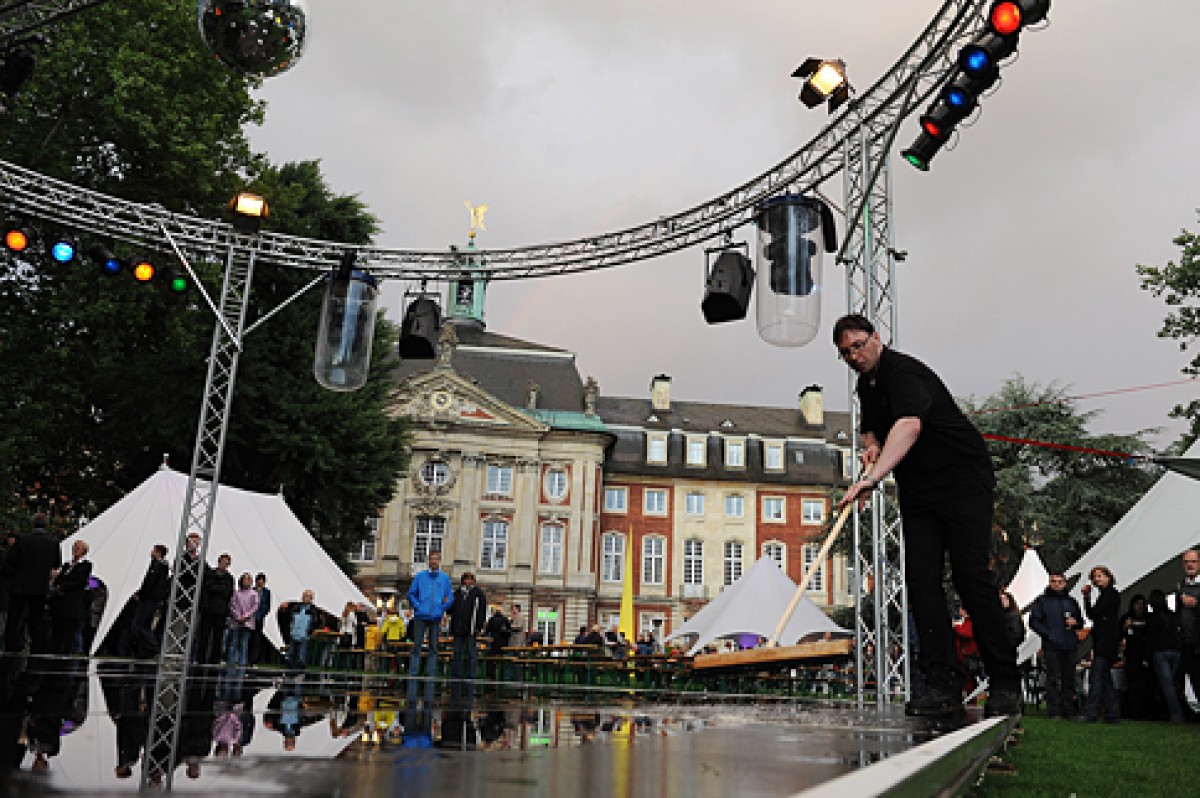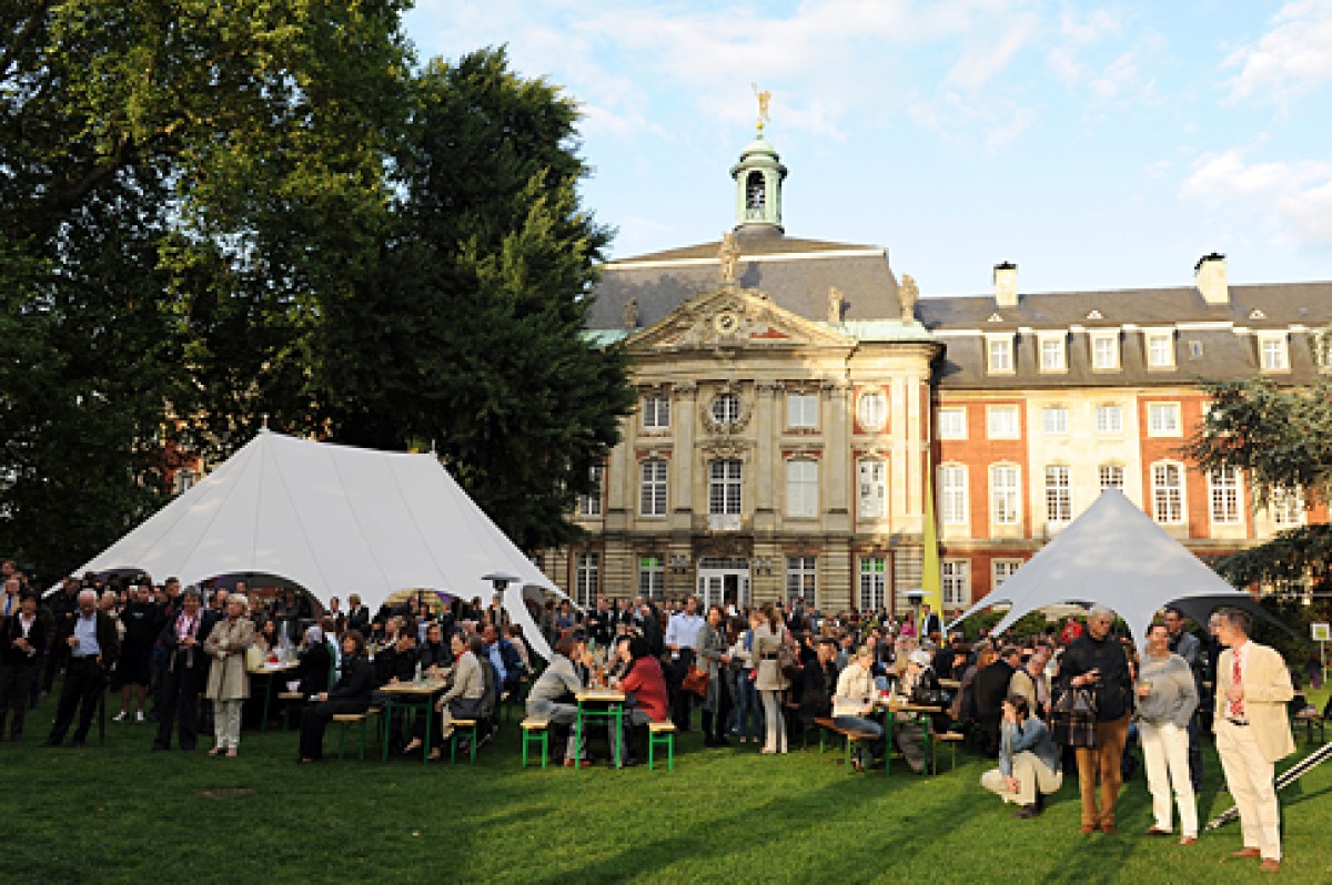 Man nehme: ein Salonorchester, eine Big Band, eine Fußball-Bundesligaspielerin und zwei pfiffige Moderatoren. Man braucht zudem: reichlich gut gelaunte Gäste, halbwegs Glück mit dem Wetter und eine kulinarische Grundversorgung. Wenn es dem Gastbegeber schließlich zusätzlich gelingt, eine beeindruckende Schloss-Kulisse sowie fünf erstklassige A-cappella-Sänger und Entertainer als I-Tüpfelchen aufzubieten – dann steht einem launigen und unterhaltsamen Sommerfest nichts mehr im Wege. Bis in den frühen Samstagmorgen hinein feierten mehrere hundert Freunde und Förderer der Universität Münster, die Wiese hinter dem Schloss war picke-packe voll. Am Samstagvormittag ging es sogar noch weiter: Die Stabsstelle Universitätsförderung hatte mehr als 120 Alumni zu einem Brunch inklusive Showkochen eingeladen. Und all das nicht zuletzt für einen guten Zweck: Das Sommerfest der WWU stand ganz im Zeichen der Initiative „Mein kleiner grüner Kaktus“ – einem Spendenaufruf des Rektorats zugunsten des Botanischen Gartens.