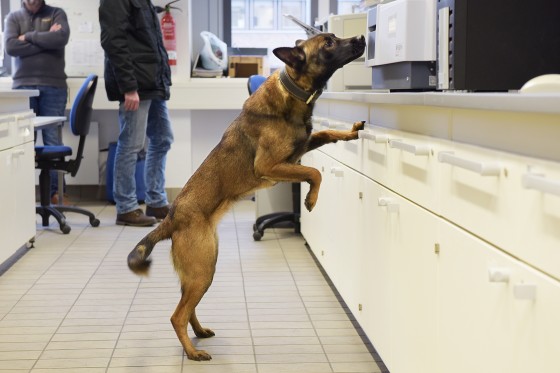 Mit ihren Pfoten kratzt Jodi auf dem Fliesenboden, die feuchte Schnauze schnüffelt. Nach einer Minute der erste Treffer: Die Hündin fiept und setzt sich, Trainer Vincent öffnet vorsichtig die Tür eines Laborschranks. Zwischen Erlenmeyerkolben, Eimern und Chemikalien hat Jodi ein gefährliches Gut entdeckt: Triacetontriperoxid, kurz TATP.