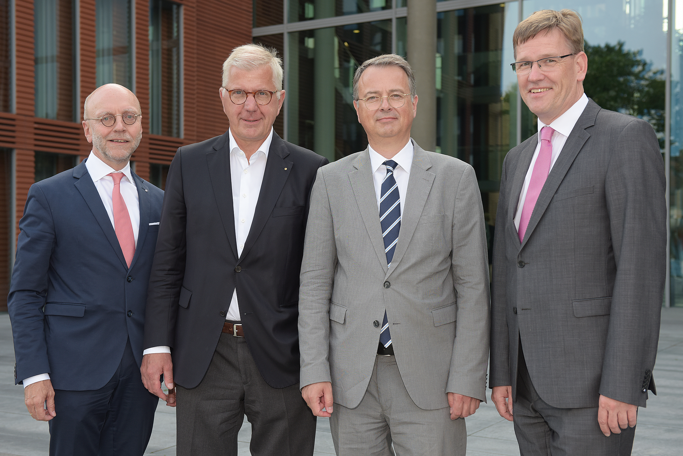 Dr. Paul-Josef Patt (l.) und WWU-Rektor Prof. Dr. Johannes Wessels (r.) begrüßen die drei neuen Kuratoriumsmitglieder Hendrik Snoek (nicht auf dem Foto), Dr. Hugo Fiege (2. v. l.) und Prof. Dr. Martin Schulze Schwienhorst.