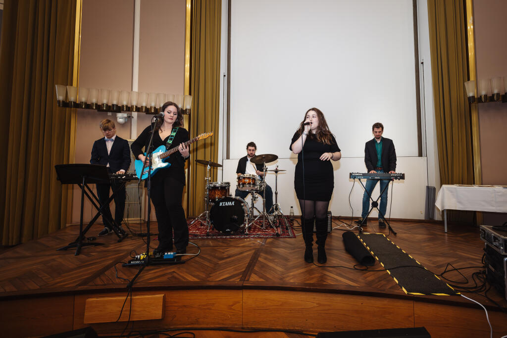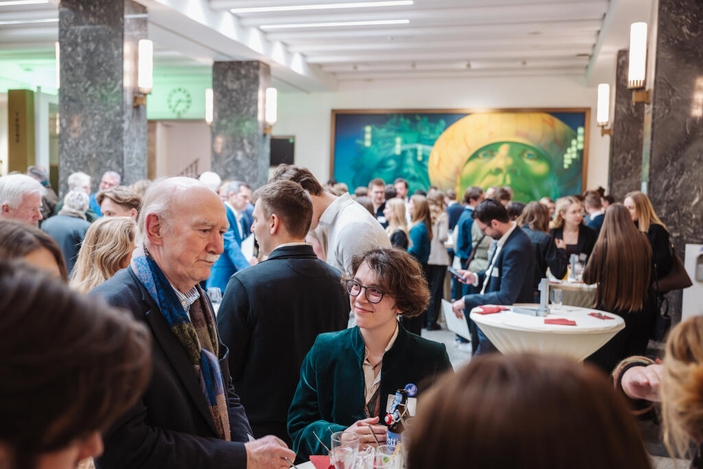 Ein weiteres Highlight war die musikalische Begleitung des Abends, die in diesem Jahr ausschließlich ProTalent-Stipendiaten übernahmen. 14 Geförderte begeisterten in verschiedenen Klassik- und Pop-Konstellationen mit Stücken von der Romantik bis heute. Die abschließende Zugabe kam vielen Gästen wie ein Kunststück vor: Gleich vier Musiker nahmen am Klavier Platz und spielten achthändig Albert Lavignacs „Galop-marche à huit mains“. Beim anschließenden Empfang im Schloss-Foyer kamen die Förderer untereinander und mit den Stipendiaten ins Gespräch.